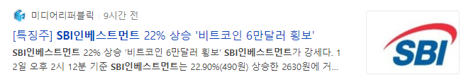 [특징주] SBI인베스트먼트 22% 상승 '비트코인 6만달러 횡보'