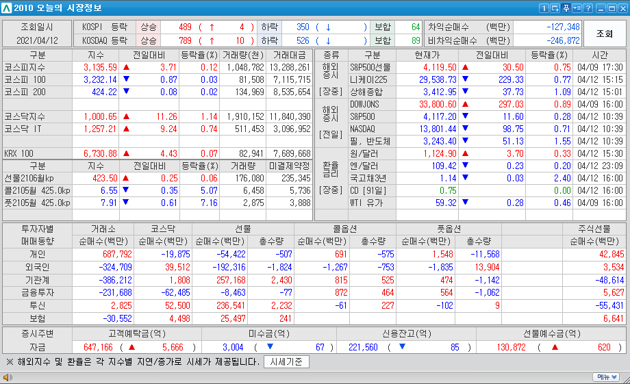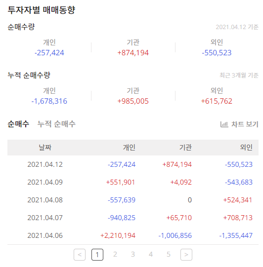 시작하기에 앞서 2021년 4우러 12일 오늘의 시장정보를 보면 코스피지수와 코스닥지수가 상승했고 코스닥지수가 1,000을 회복을 했습니다. 2021년 1월 26일 이후 회복을 한것이며 오늘도 개인은 매수를 했고 외국인,기관,금융투자는 매도를 했습니다.