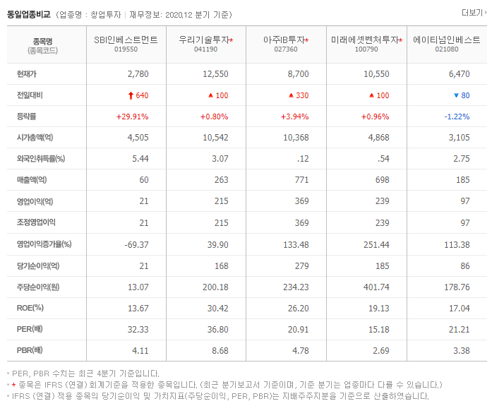 SBI인베스트먼트019550의 WICS 분류기준으로 업종 창업투자로 동일업종비교를 해보겠습니다.