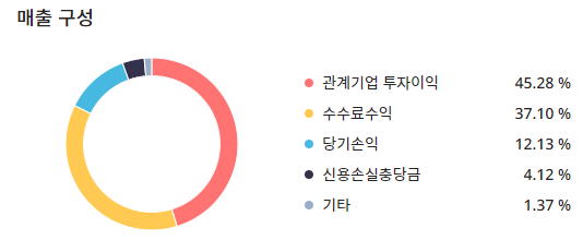 매출구성으로는 관계기업 투자이익:45.28%, 수수료수익:37.10%, 당기손익:12.13%, 신용손실충당금:4.12%, 기타:1.37%입니다.