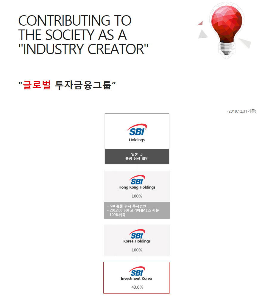 SBI인베스트먼트019550는 일본 및 홍콩 상장법인이 있으며 관계사 현황 및 홈페이지에서 소개된것 처럼 에스비아이코리아홀딩스의 지분율 43%정도를 가지고 있습니다.