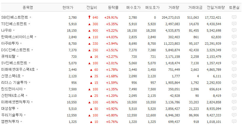SBI인베스트먼트가 상승률 1위입니다 상한가를 갔기 때문이죠