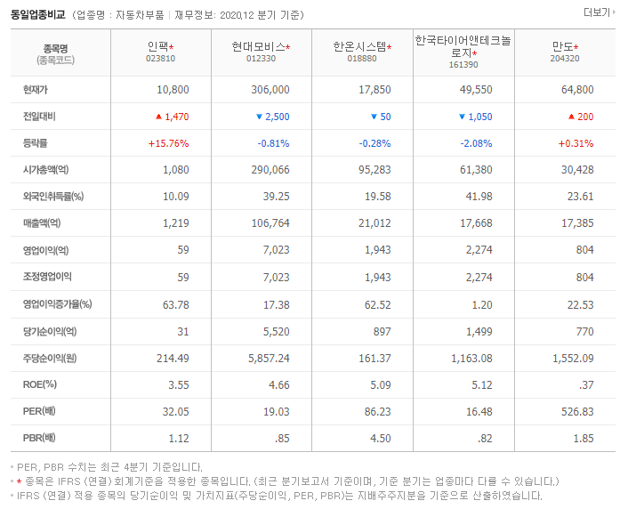 인팩023810의 WICS:자동차부품 분류로 동일업종을 확인을 하면 현대모비스012330, 한온시스템018880, 한국타이어앤테크놀로지161390, 만도204320이 보입니다.