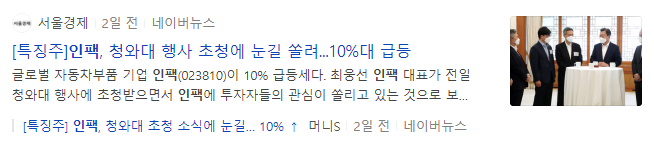 [특징주]인팩, 청와대 행사 초청에 눈길 쏠려 10% 급등