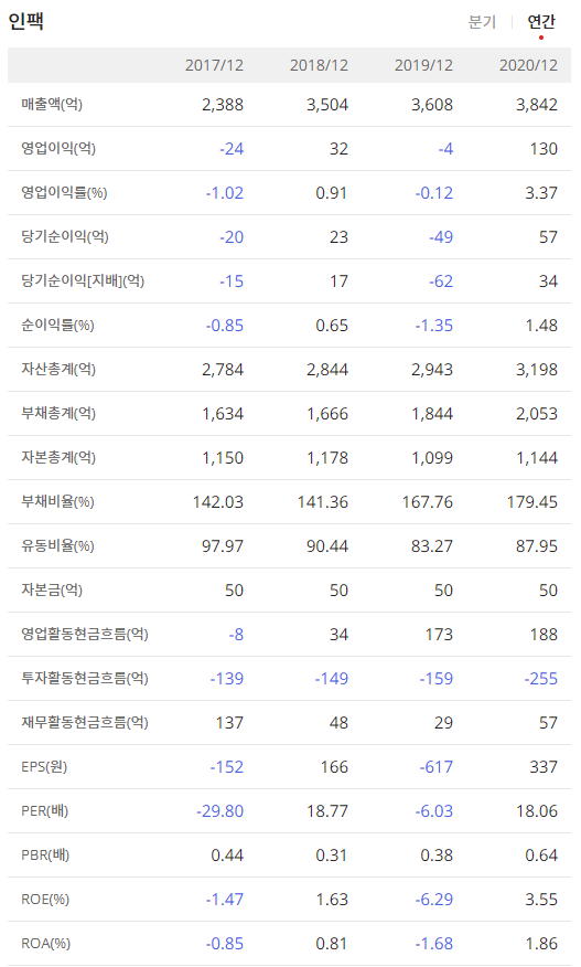 인팩023810의 분기 매출과 연간 매출을 확인을 하면 지속적으로 상승을 하고 있는 것을 볼 수 있습니다.