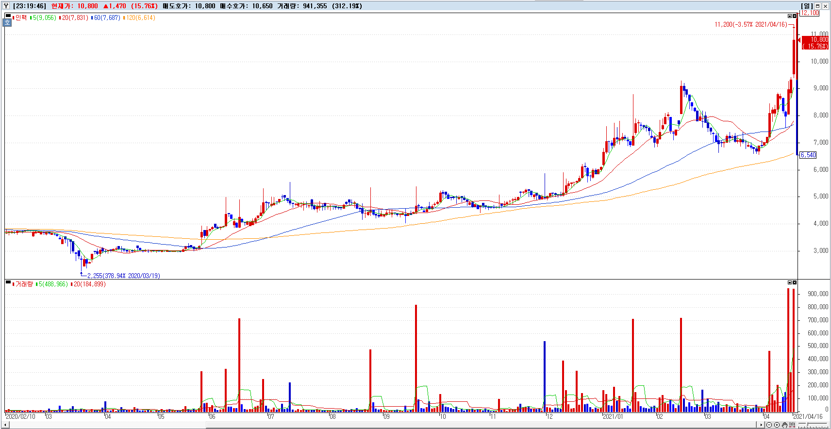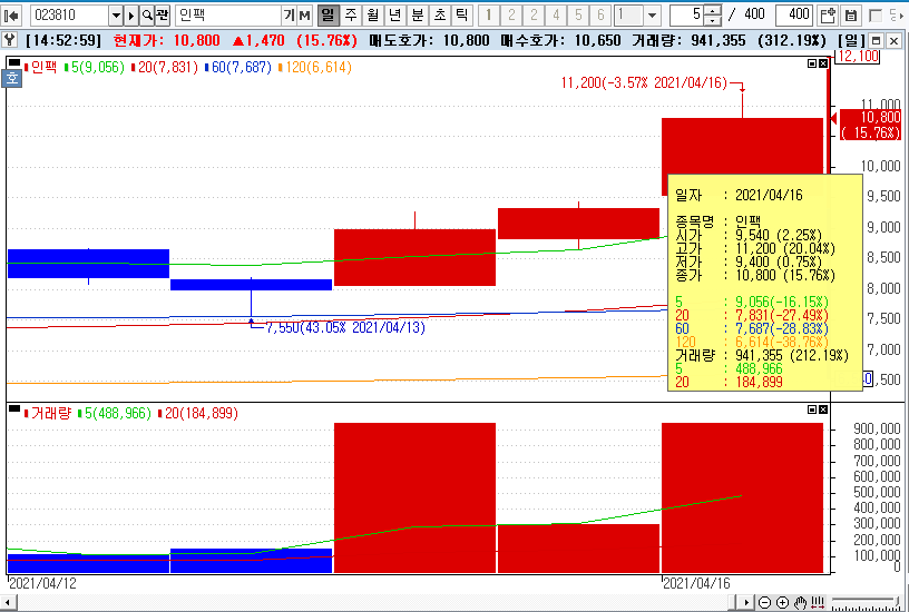 인팩023810종목정보은 COVID-19 영향으로 2020년 3월 19일 2,255원을 찍고 4,500원 근처에 주가가 움직이다가 2021년 2월 16일 9,300원을 찍고 하락하다가 2021년 4월 16일 11,200 고점을 찍고 10,800원에 장을 마감했습니다.