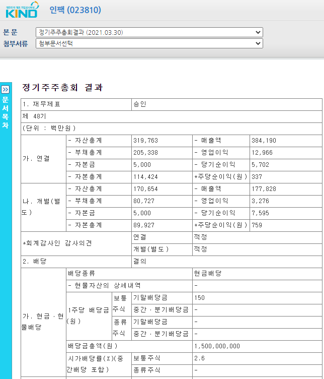 인팩023810 정기주주총화결과 2021년 3월 30일 현금배당 1주당 150원이며 시가배당률은 2.6%입니다.