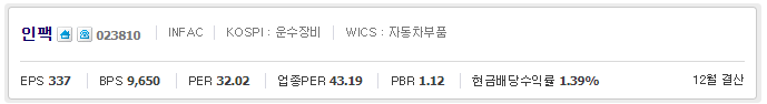 인팩023810 코스피:운수장비, WICS:자동차부품, EPS:337, BPS:9,650, PER:32.02, 업종PER:43.19, PBR:1.12, 현금배당수익률:1.39%, 산업군:자유소비재, 세부산업군:자동차및부품 입니다.