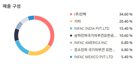 매출구성으로는 (주)인팩:34.60%, 기타:20.40%, INFAC INDIA PVT.LTD:15.40%, 삼하인파극기차부건유한공사:10.60%, INFAC AMERICA INC:6.80% 강소인파 극기차부건 유한공사:6.80%, INFAC MEXICO PVT.LTD5.40%로 구성되어 있습니다.