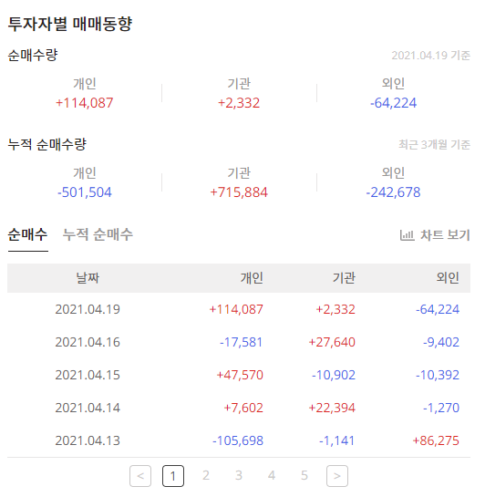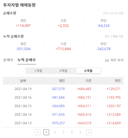 6개월을 기준으로 하면 개인은 매도를 기관은 매수를 했습니다.