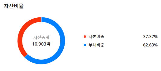 성신양회004980의 자산총계는 1조 903억이며 자본비중:37.37%, 부채비중:62.63%로 구성이 되어 있으며