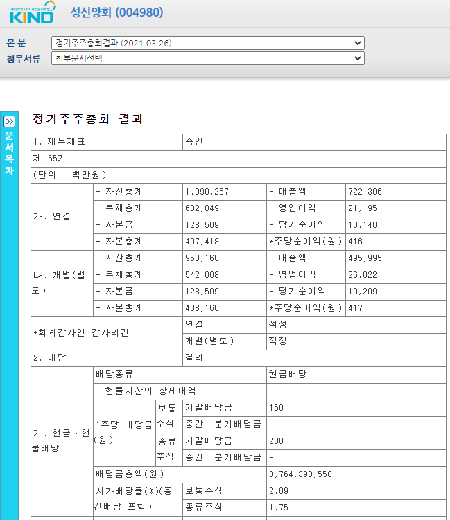 성신양회004980의 현금배당수익률이 있기 때문에 2021년 정기주주총회 공시를 가져왔습니다.