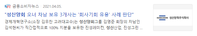 성신양회 오너 차남 보유 3개사는 회사기회 우용 사례 판단