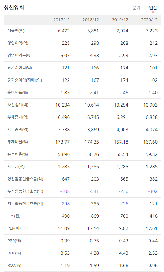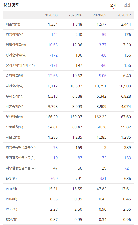 성신양회는 2020년 9월 3분기 매출보다 2020년 12월 4분기 매출과 영업이익 순이익이 좋은것을 볼 수 있으며 연간 매출액을 보면 조금씩 상승하는것을 볼 수 있으나 2020년도에 순이익이 하락 한것을 볼 수있습니다.