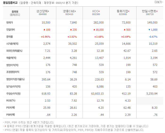 성신양회004980의 WICS 분류 기준 건축자재 동일 업종을 비교해보겠습니다.