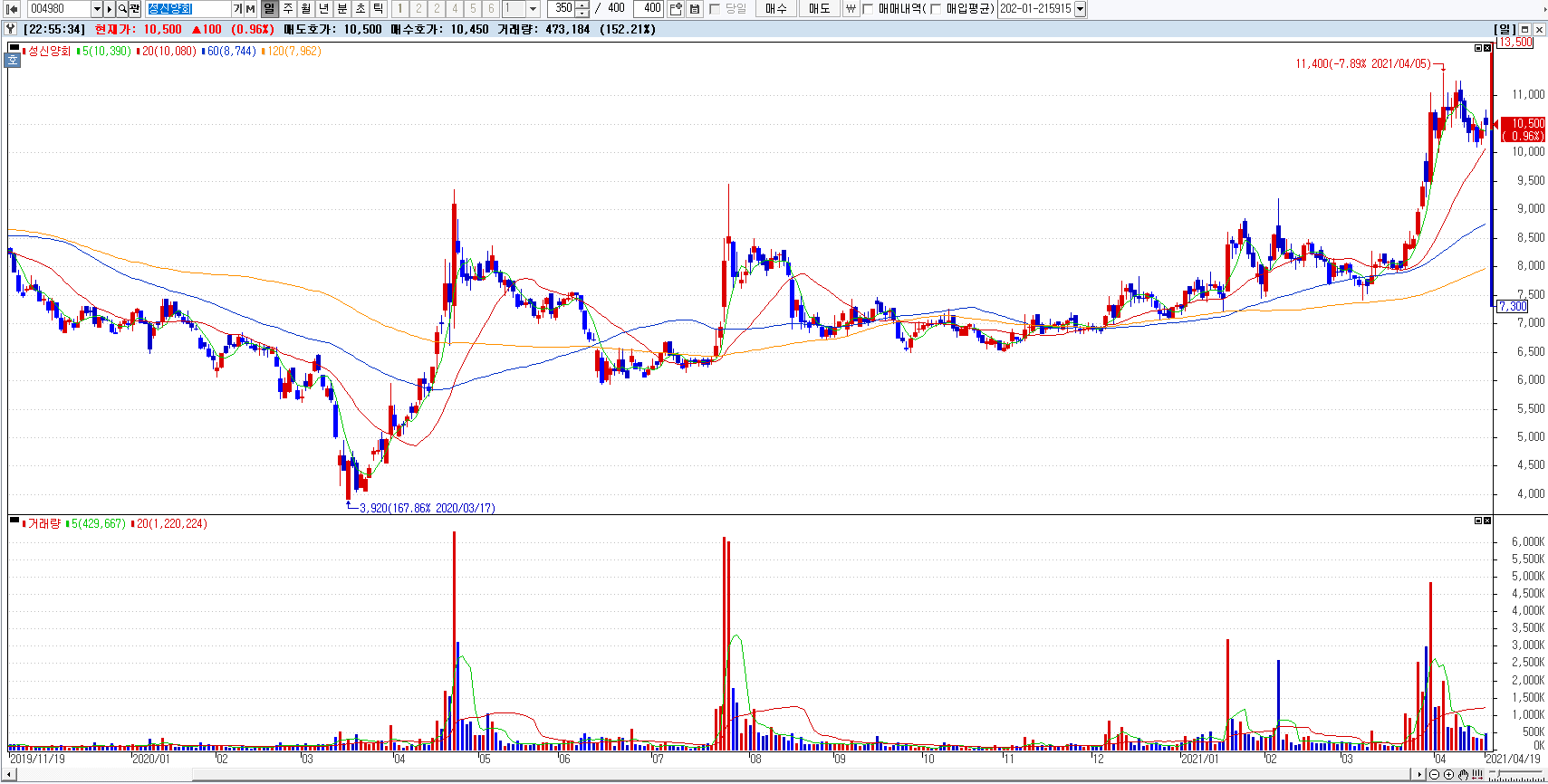 성신양회004980도 COVID-19 영향으로 2020년 3월 17일 3,920원을 찍고 7,000원 대에서 있다가 2021년 3월 23일 부터 계속 상승해서 52주 최고 11,400원을 찍었습니다. 대단합니다. 그리고 2021년 4월 19일 10,500원 종가로 마무리 하였습니다.