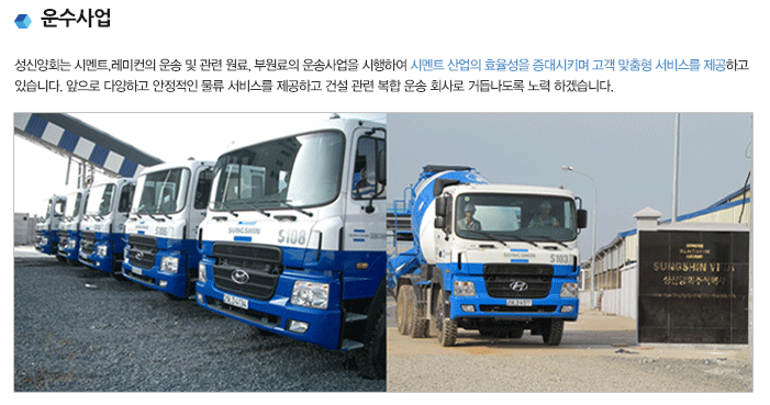 성신양회004980는 하노이 지역을 중심으로 베트남 사업을 영위하고 있으며, 영업 역량 강화와 신규산업 진출, 사회공헌 활동 등을 통해 베트남 시장에서의 경쟁력이 있으며 서울 종로구에 위치한 본사를 비롯하여 단양과 부강에 크링커ㆍ시멘트 생산공장을 보유하고 있으며, 시멘트 출하공장ㆍ영업소 및 레미콘 생산공장을 운영하고 있습니다.