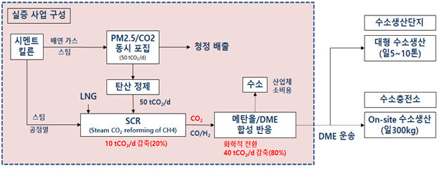 시멘트 제조업체인 성신양회에서 시멘트를 만드는 과정에서 발생하는 이산화탄소를 한곳에 모았다가(포집), 용광로에서 시멘트 원료를 가열(소성)할 때 발생하는 450도 안팎의 공정열로 화학반응시켜 메탄가스를 만든다. 이를 다시 천연가스(LNG)와 합성반응시켜 메탄올, 경유를 대체할 수 있는 청정 합성연료 디메틸에테르, 차량 연료 등에 쓰이는 수소 등을 생산해낸다는 구상이다.
