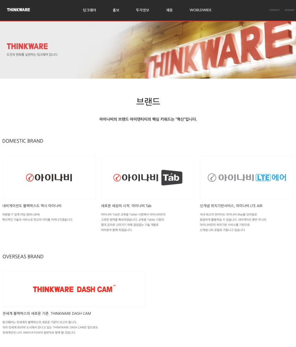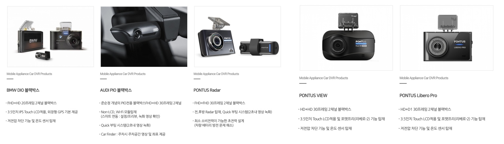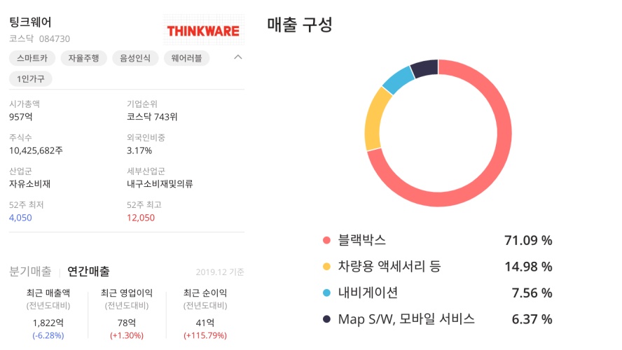 팅크웨어(084730) 1997년 3월에 설립되었으며 내비게이션 및 Map S/W, 차량용 블랙박스, 태블릿 PC, LBS(위치기반서비스) 사업을 영위하고 있으며 아이나비 내비게이션과 연동하는 `아이나비Black` 출시를 시작으로 동 사업에 진출하였으며 이후 HD부터 QHD까지의 고화질 블랙박스 출시를 통해 보급형과 고급형 제품 라인업을 구축하고 있으며 차선이탈경보, 전방추돌경보, 앞차출발알림 등 운전자의 운전 편의성을 높이고 있다고 합니다.