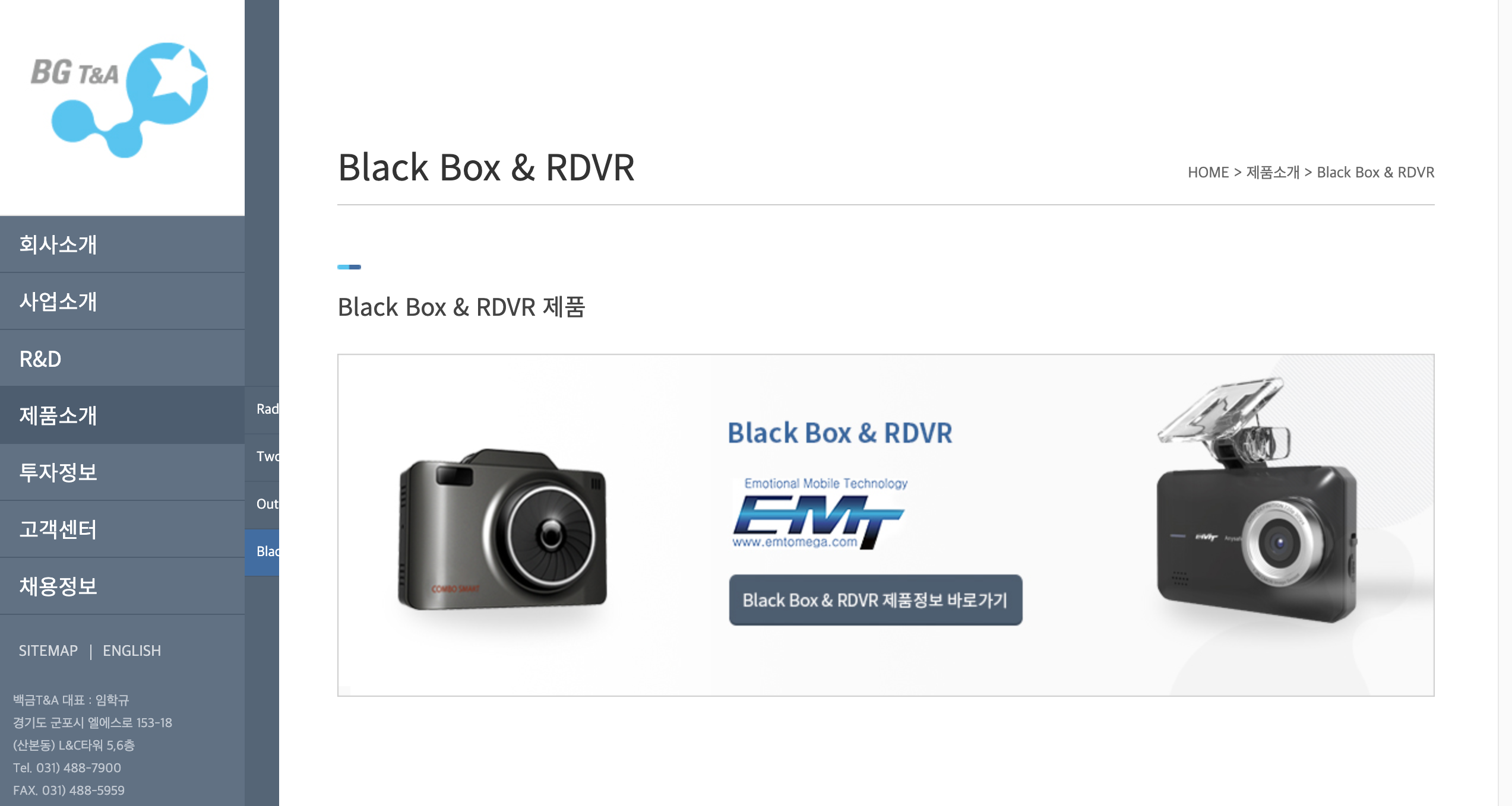 백금T&A는 크게 Radar Detecter(RD), 무전기(TWR), 블랙박스, RDVR콤보로 4가지 제품군을 주요사업으로 영위하며 블랙박스의 장점과 독보적인 레이더 감지 기술을 결합하여 새로운 시장 세그먼트를 형성하였고 시장 리딩업체로서 새로운 기술을 지속적으로 발전시켜 시장 수요를 창출하고 있습니다.