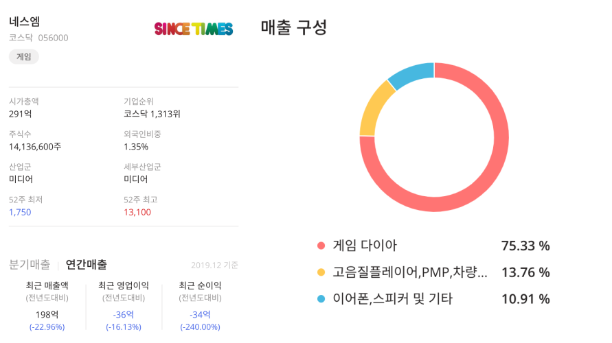 네스엠 (056000) 1995년 4월 설립되었으며, 모바일 게임 퍼블리싱(유통) 전문 업체임. 종속회사 코원시스템은 고음질 음원 플레이어, 차량용 블랙박스 등 디지털 디바이스 제조, 판매업을 주로 합니다. '해전1942'과 '해전M'이 동사 주요 게임임. 동사는 MMORPG 게임을 선보이기 위해 준비하고 있음. 디지털 디바이스 사업 부문은 스마트폰 상용화로 인해 시장이 침체됐으나 고품질 음원기기 'PLENUE' 라인을 구축해 성장을 도모하고 있습니다.