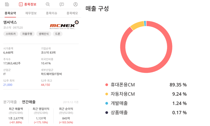 엠씨넥스(097520)는 2004년에 CCM기술을 기반으로 설립한 영상전문기업으로써 휴대폰용 카메라모듈과 자동차용 카메라모듈을 주력제품으로 생산하고 있습니다.