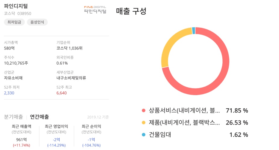 - 매출은 차량용블랙박스 74.64%, 영상처리칩 25.36%의 비중으로 구성되어 있음.
