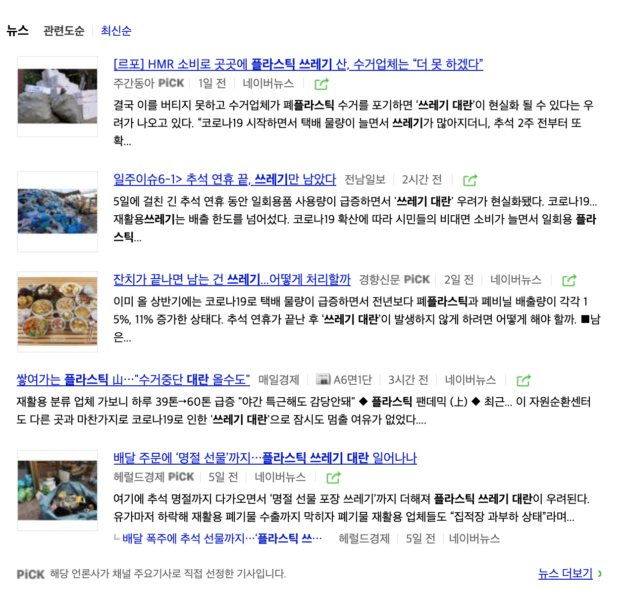 많은 양의 쓰레기로 인해서 불이 나는등 많은 문제가 있었고 재활용업체는 수거하여도 돈이 안되는 상황이며 비용 문제로 법적공방이 이어지고 있던 와중에 기억에서 지워질때 쯤에 플라스틱 쓰레기 산 수거업체는 "더 못 하겠다." 추억 연휴 끝, 쓰레기만 남았다라는 기사제목 그리고 플라스틱 쓰레기 대란 일어나나 라는 기자제목과 기사내용은 마스크와 배달음식 온라인 주문 활성화 등등 이제 쓰레기에 대해서 관심이 생겼습니다.