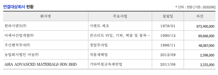 한라시멘트는 자금난과 IMF 영향으로 1998년 12월 RH시멘트(주)로 영업을 양도 이후에 시멘트 부문 세계 2위 프랑스 라파즈에 매각 되었으나 2016년 3월 국내 사모펀드로 매각이후 2018년 1월 아세아시멘트에 매각함으로 한라시멘트는 아세아시멘트의 계열사로 편입되어서 아세아시멘트로 보시면 됩니다.