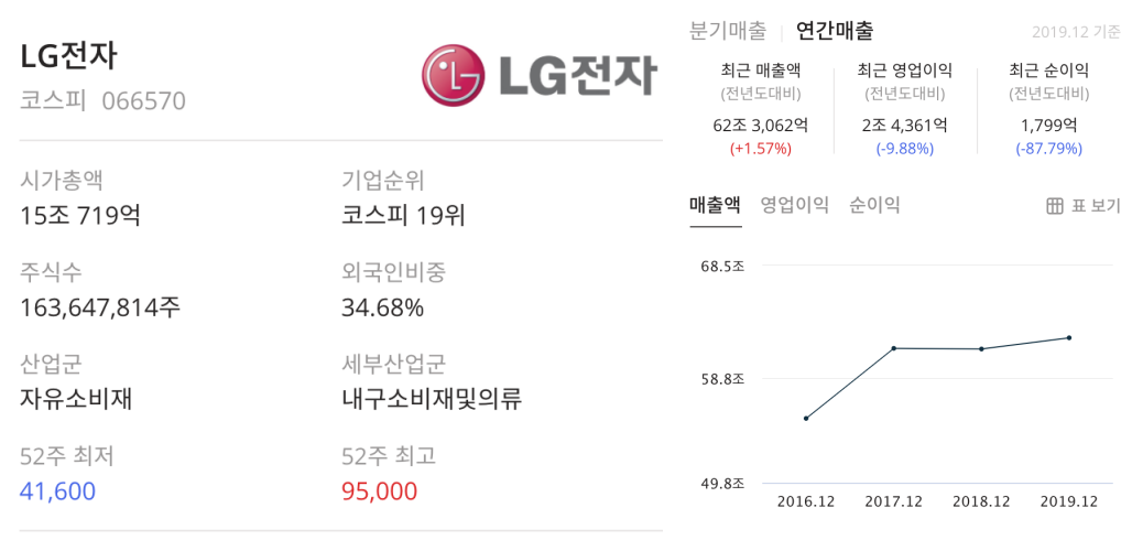 LG전자(066570)는 업종 내 순위 시가총액 1위(15조 719억)이며 코스피 19위 입니다.