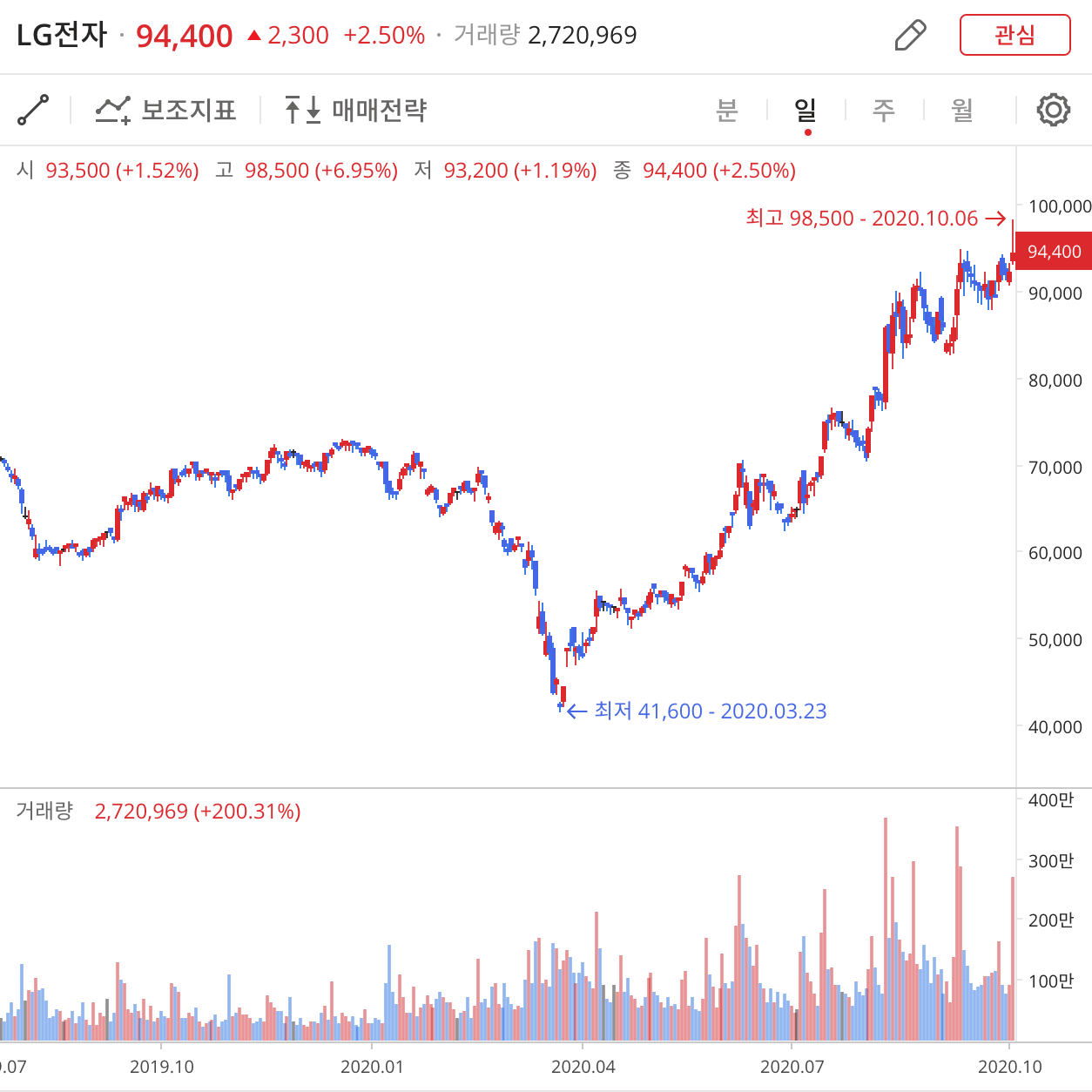 3월 COVID19 영향으로 2020년 3월 저점 41600원을 찍고 94,400원까지 대략 227%가 올랐습니다.