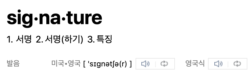 시그니처를 검색을 해보면 서명,서명하기,특징이라고 뜻이 나옵니다. 바로 SIGN을 뜻하는것인데요 사인은 나를 표현하는 나만의 것이기 나를 대표하는 나는 확인을 했다는 의미로 현재 사용을 하고 있습니다. 그러므로 시그니처는 대표적인 나를 표현하는 것이라고 생각하시면 됩니다.