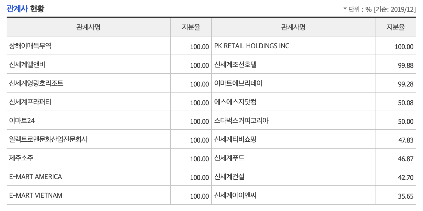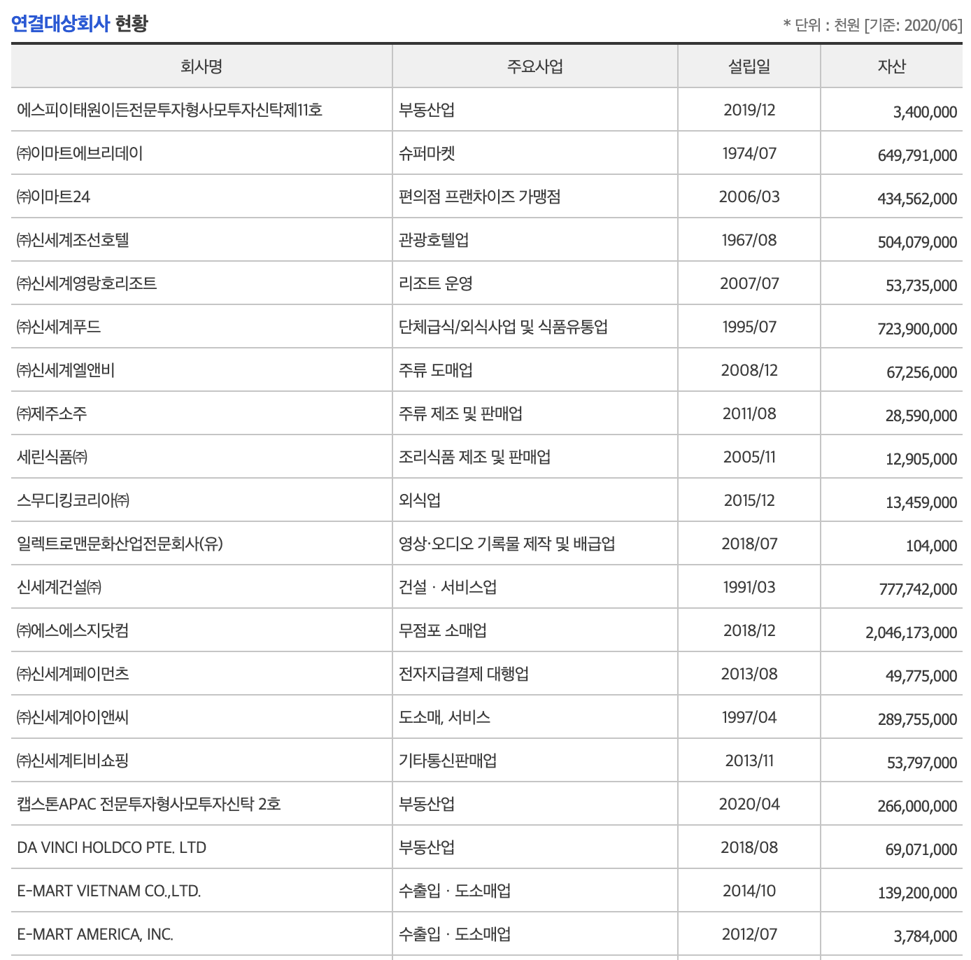 이마트(139480)는 2011년 5월 (주)신세계로부터 인적분할하여 설립되었으며, 연결대상 종속기업으로 (주)신세계조선호텔, (주)신세계푸드, (주)이마트에브리데이, (주)스타필드고양 등을 보유하고 있으며 2020년 상반기 대형마트 매출액은 증가하였으나, 채널간 경쟁 심화, 언택트 소비 확산 등의 영향으로 국내외 시장환경은 어려울 것으로 예상하고 있습니다.