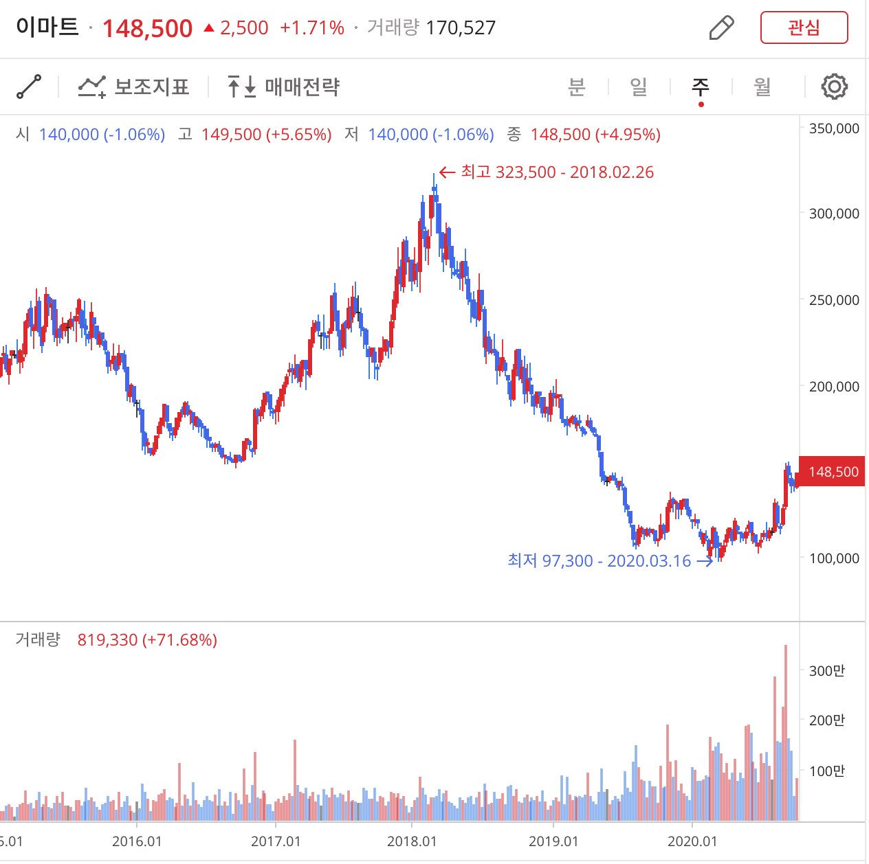 2018년 2월 에 최고 323,500원을 찍고 COVID19 2020년 3월 최저 97,300 을 찍고 현재 148,500원에서 움직이고 있습니다.
