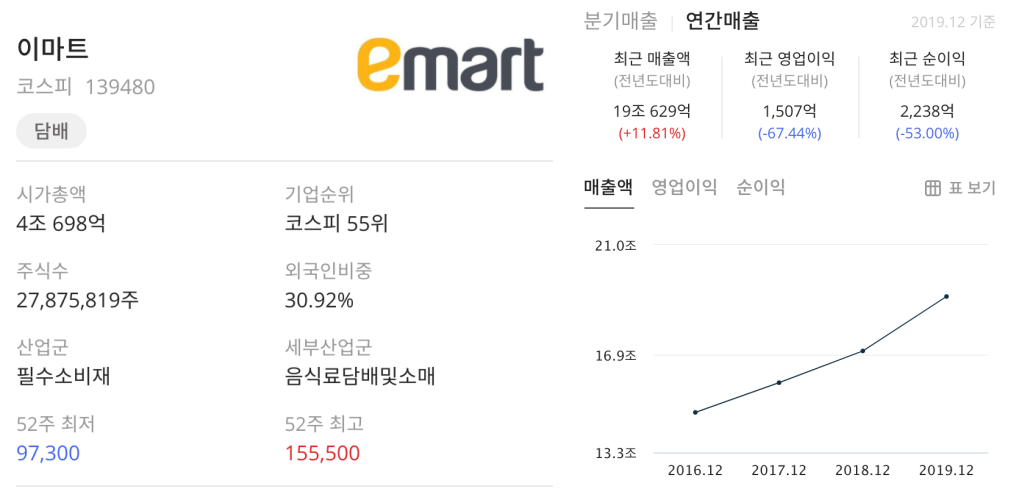 이번 포스팅은 뉴스 기사 제목을 보다가 코스트코 잡는다 이마트 트레이더스 10년만에 매출 3조 눈앞이라는 기사 제목을 보고 이마트에 대해서 종목을 알아보려고 합니다. 예전에 이마트 하면 신세계라고 생각 하셨지만 이마트는 신세계에서 2011년 5월 (주)신세계로부터 인적분할하여 설립되었기 때문에 이마트 따로 신세계 따로 입니다. 이마트와 신세계백화점이 같이 있는 경우가 있으면 같지만 다른 회사 입니다.