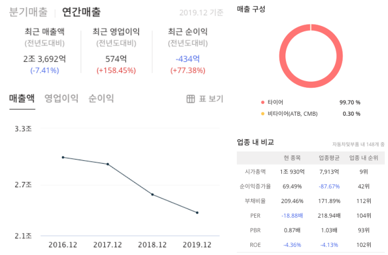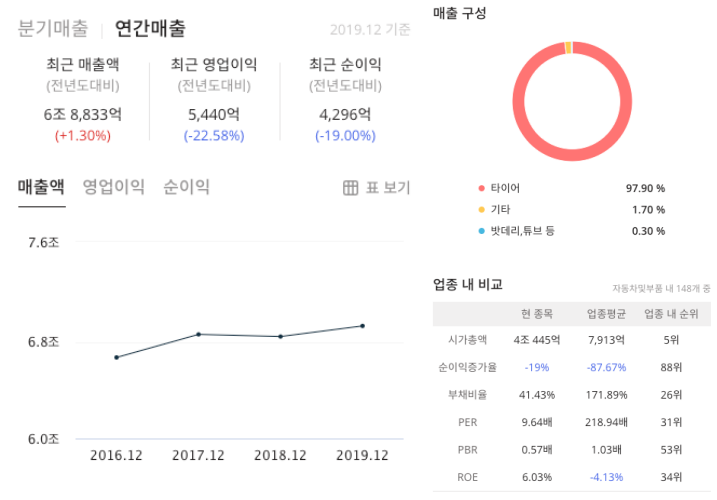국내 타이어 3사중에 매출액 부분도 가장 큽니다.