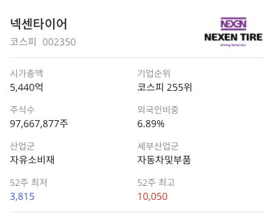 넥센타이어(002350)는 업종 내 시가총액 13위(5조 440억)이며 기업순위:코스피 255위, 외국인비중:6.89%,산업군:자유소비재,세부산업군:자동차및부품 입니다. 넥센타이어(002350) 기업은 최근에 언텍트 마케팅으로 비대면 타이어 교체 관련한 광고가 있습니다.