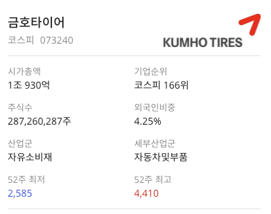 금호타이어(073240)는 업종 내 시가총액 9위(1조 930억)이며 기업순위:코스피 166위, 외국인비중:4.25%,산업군:자유소비재,세부산업군:자동차및부품 입니다. 금호타이어(073240) 기업은 지속적으로 노사관계 관련된 뉴스가 나오고 있습니다.