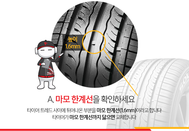 타이어 마모 한계선 이상으로 사용을 한다면 제동(브레이크)시에 자동차가 밀림현상이 발생되여 앞차와 간격이 있더라도 사고로 이어질 수 있습니다.