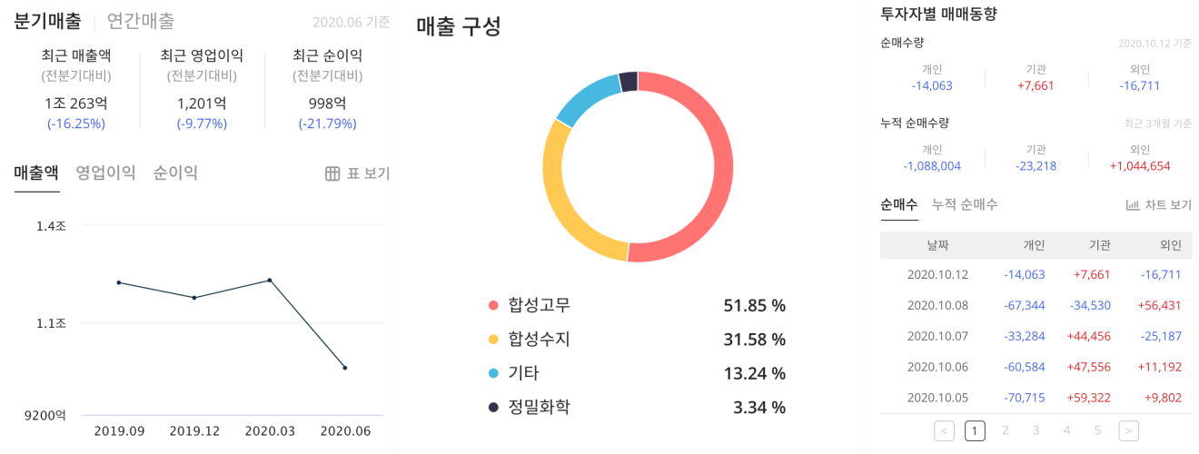매출 구성은 합성고무 51.85%, 합성수지 31.58%, 기타 13.24%, 정밀화학 3.34% 로 되어 있으며 누적 순매수량은 외인이 높습니다.