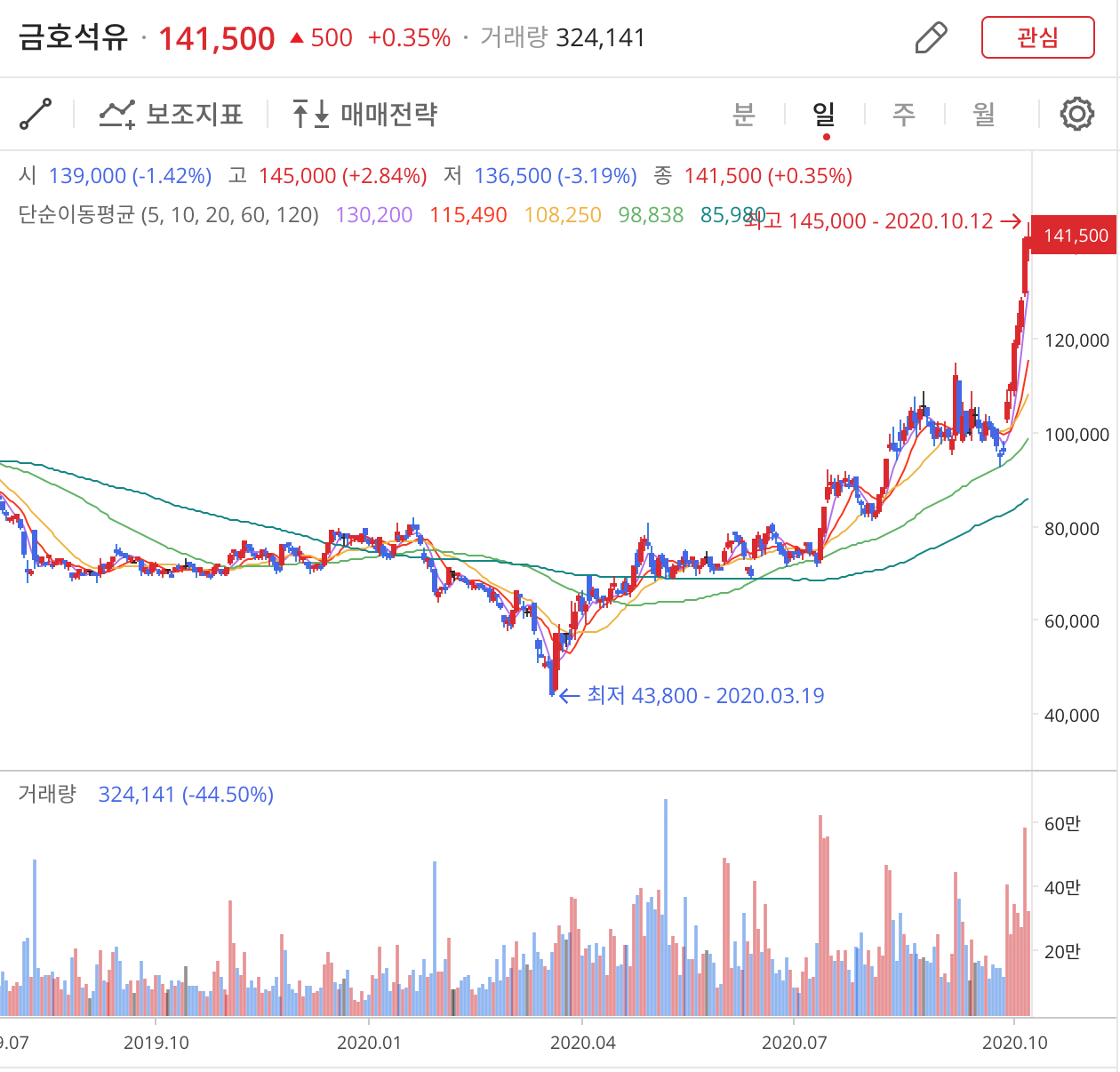 처음은 52주 신고가 종목에 있어서 금호석유를 찾아보니 주가가 쭉쭉 올라가고 있었습니다.