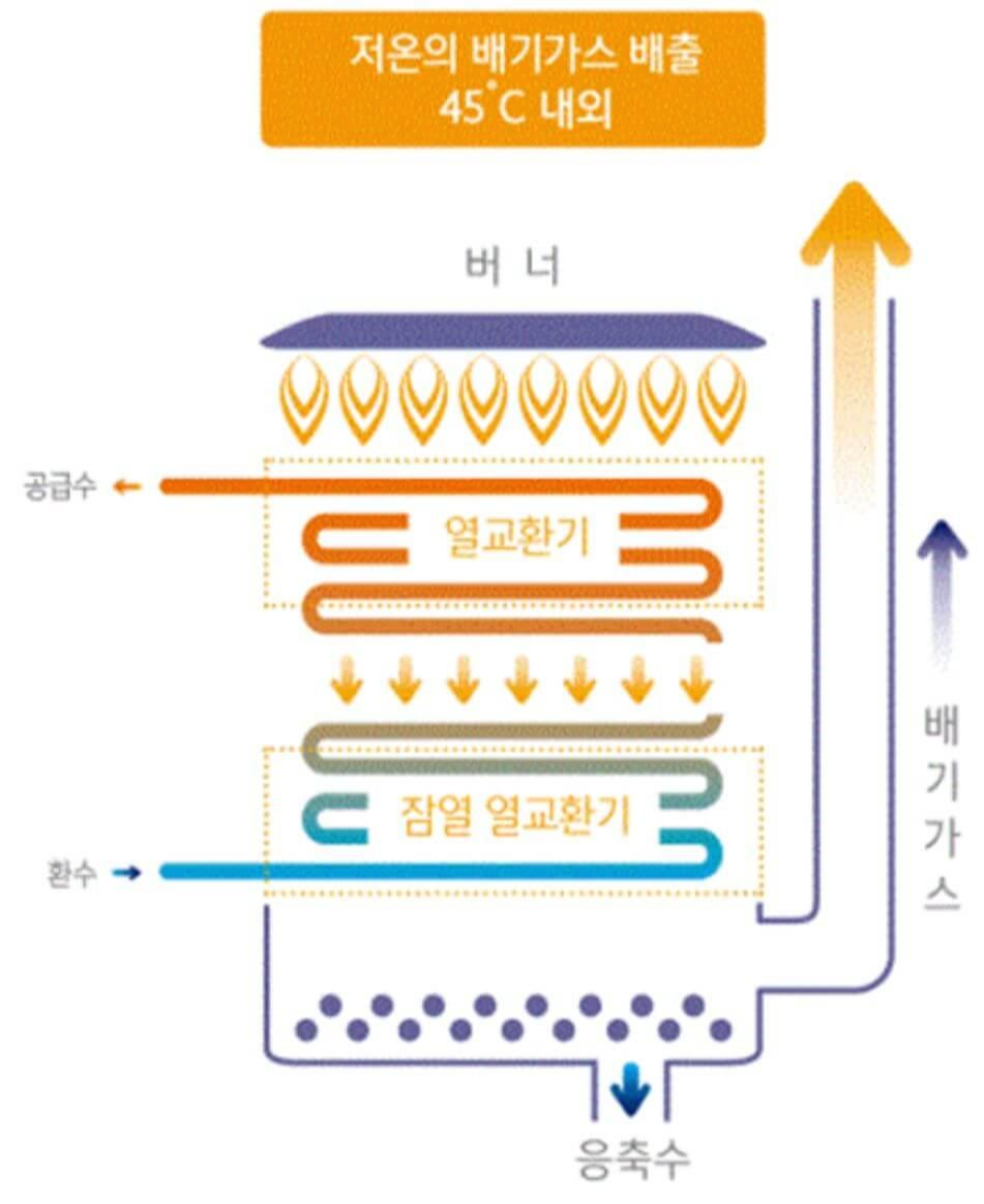 이 배출 에너지를 흡수해 효율 성을 높이도록 제작한 것이 콘덴싱보일러 입니다.