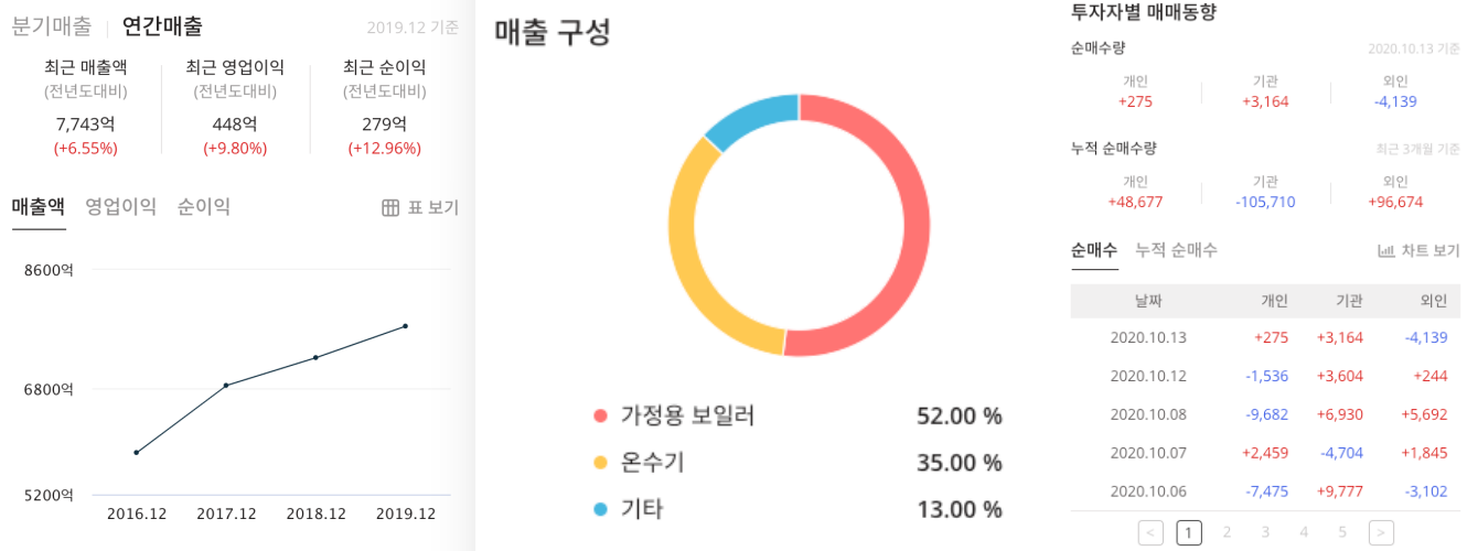 매출구성은 가정용 보일러:52.00%, 온수기 35.00%, 기타:13.00% 누적 순매수량은 외인이 높습니다.