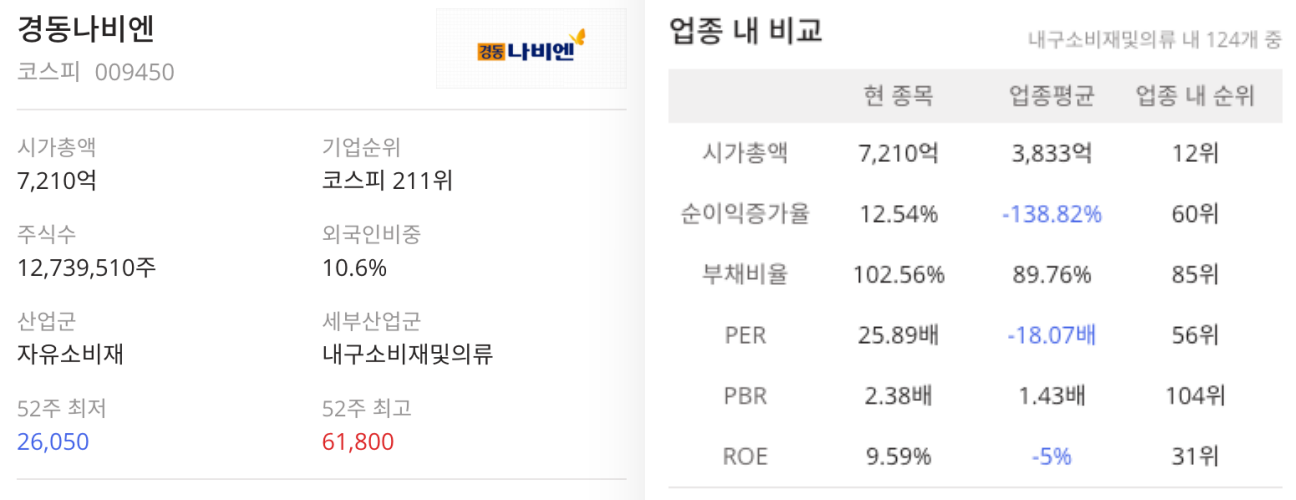 경동나비엔(009450)은 시가총액 7,210억 이며 기업순위:코스피 211위 이며 외국인비중:10.6%입니다. 산업군:자유소비재, 세부산업군:내구소비재및의류 입니다.