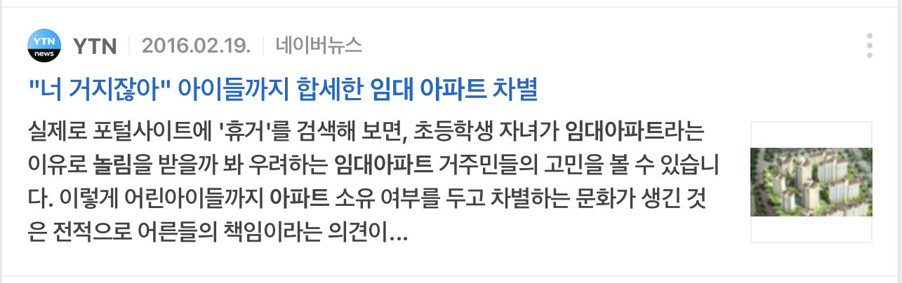 최근에 ‘휴거’라는 말을 듣고 마음이 아픈 시간이였습니다 . 휴거란 휴먼(human)거지를 줄여서 말하는 말로 임대 아파트에 사는 사람들을 낮게 부르는 말이라고 합니다.
