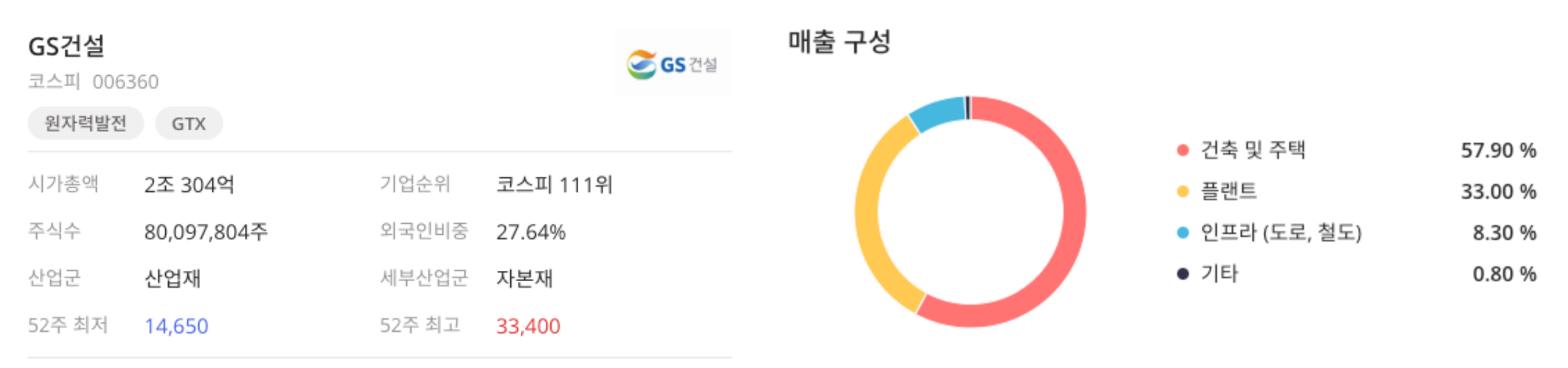 GS건설(006360)은 GS그룹 계열의 국내 선두권 대형 종합건설업체, 플랜트(정유/가스, 석유화학, 발전소, 전력제어), 건축, 주택(자이 아파트 브랜드 보유), 인프라(도로, 철도) 사업 등을 영위, 정유 및 석유화학 플랜트사업 부문에서 세계 최고 수준의 경쟁력을 가지고 있습니다.