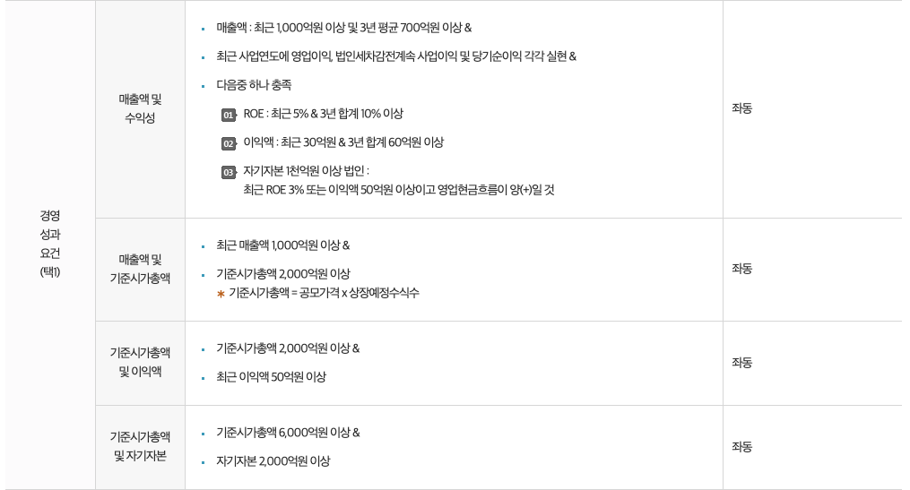4가지의 조건중은 매출액이 최소 최근 1,000억이상(3년 평균 700억원 이상) 및 최근 이익액 50억원 이상 그리고 자기자본 및 기준시가총액 2,000억 이상이 되어야 될거 같습니다.