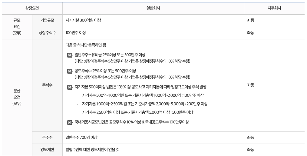 코스피상장 규모요건은 자기자본 300억원 이상이며 상장주식수는 100만주 이상입니다.