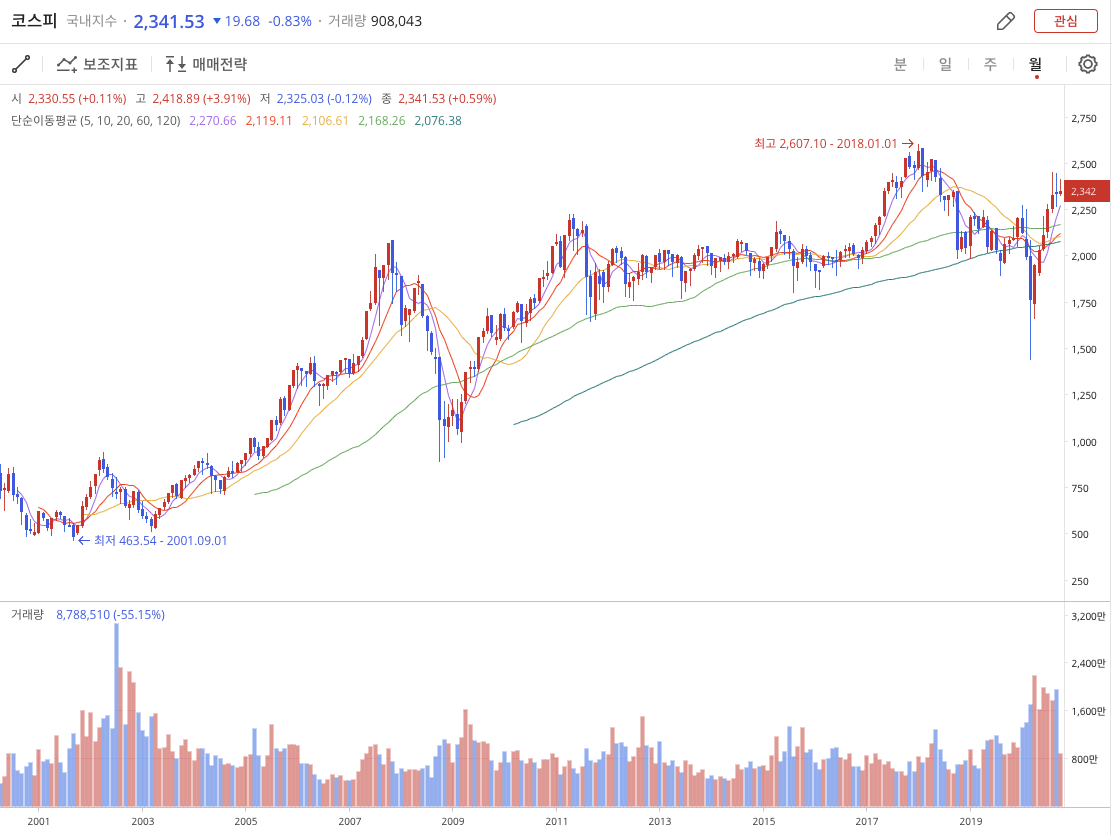1980년 1월 4일 코스피 100(코스피시장의 시가총액을 지수)에서 현재 2020년 10월 16일 코스피지수를 산출하고 있습니다.
