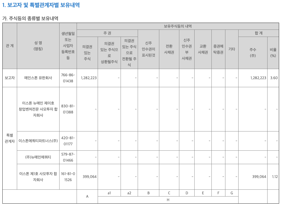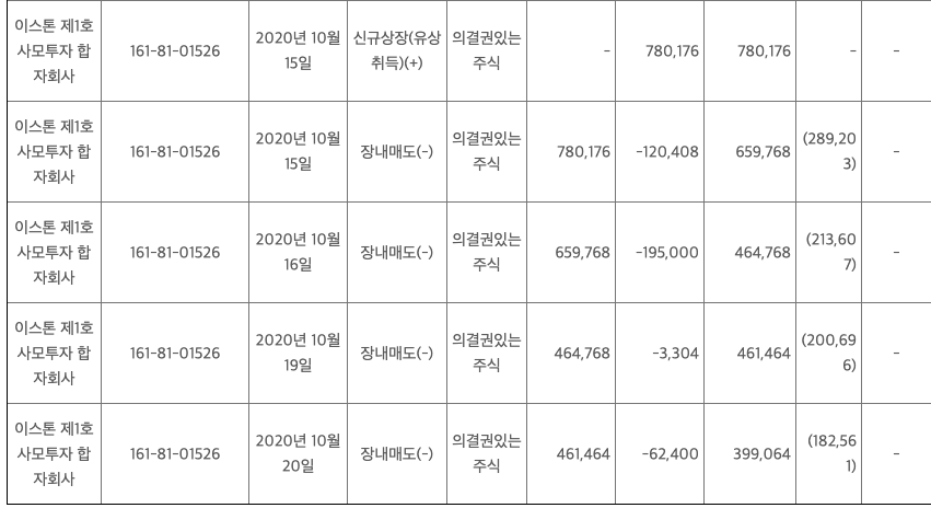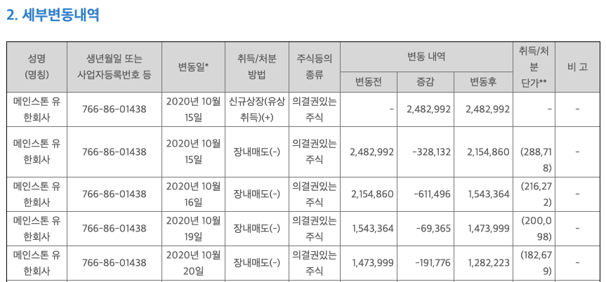 상장일인 2020년 10월 15일 부터 장내매도를 통해 주식수가 변동이 되었습니다. 2,482,992주에서 1,282,223주로 변경되었는데요